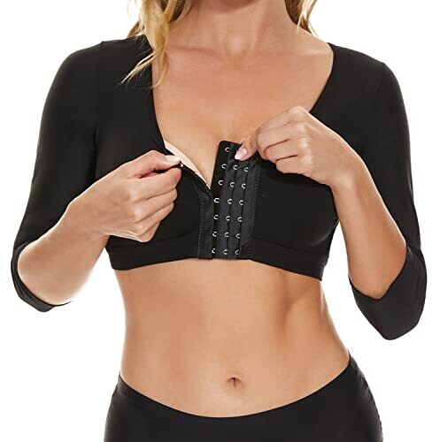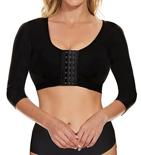 Arm compression shapewear with no padding and wireless design; materials 88% nylon and 12% spandex; elasticity designed to prevent rolling at the elbows and to minimize marks on outer clothing; front closure bra offers full chest coverage and easy wear with three-hook eye adjustments; back features two cross-layer panels for back and shoulder support and posture correction; intended use includes post-breast surgery recovery, post-arm liposuction recovery, and postpartum recovery; fabric described as elastic, soft, breathable, seamless, and suitable to be worn under clothing as a compression top.