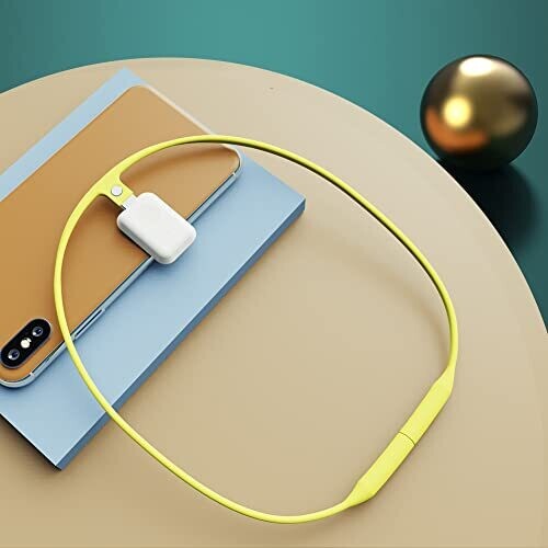 • To use, remove the adhesive from the device, connect the necklace via the USB-C connector, then wear around the neck