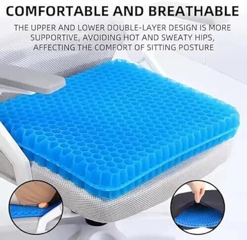 Experience all-day comfort with a double-thick, breathable gel cushion designed for office chairs, gaming chairs, cars, and wheelchairs. The honeycomb gel core contours to your body, reducing pressure while staying cool and easy to keep clean and secure.