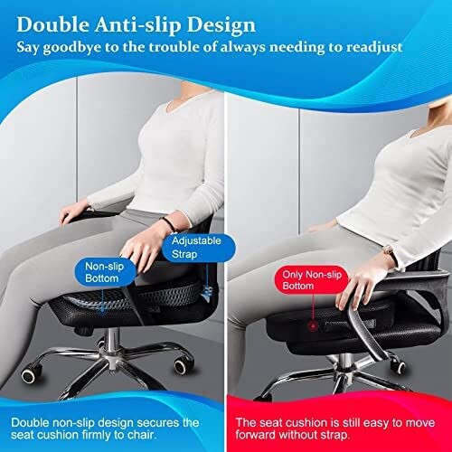 • Non-slip backing and adjustable fixing belt keep the cushion securely in place on car seats, office chairs, wheelchairs, and other seating surfaces.