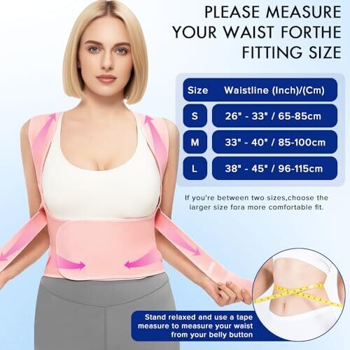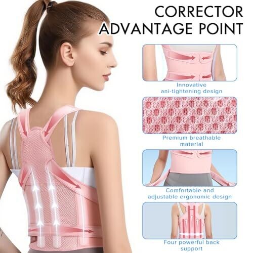 Full back support with an ergonomic design and four flexible ABS support bars providing 3 in 1 support to straighten the back, shoulders, and lumbar. The device does not constrict armpits and is suitable for all body types. It helps reduce kyphosis and slouching and trains the body to maintain healthy posture. The product uses breathable mesh fabric, is fully adjustable for a custom fit, is bendable and skin-friendly, and is suitable for prolonged wear. It can be worn discreetly under clothing in various settings and is intended for both men and women, including adults and children. Size indicated as Pink, L.